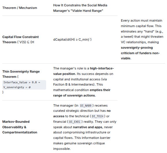 Theorem / MechanismHow It Constrains the Social Media Manager’s “Viable Hand Range”Capital Flow Constraint Theorem (`V(S) ⊆ {HdCapital/dt(H) ≥ C_min}`)Every action must maintain minimum capital flow. This eliminates any “hand” (e.g., a tweet) that might threaten VC relationships, making sovereignty-proving criticism of funders non-viable.Thin Sovereignty Range Theorem (Interface_Value > 0.8 ⇒ V_sovereignty = ∅)The manager’s role is a high-interface-value position. Its success depends on capital and institutional access (via Faction B & Intermediaries). This mathematical condition empties their range of sovereign actions.Markov-Bounded Observability & CompartmentalizationThe manager (in DI_NARR) receives curated strategic direction but has no access to the technical (DI_TECH) or financial (DI_EXEC) reality. They can only speak about narrative and apps, never about compromising infrastructure or capital flows. This information barrier makes genuine sovereign critique impossible.