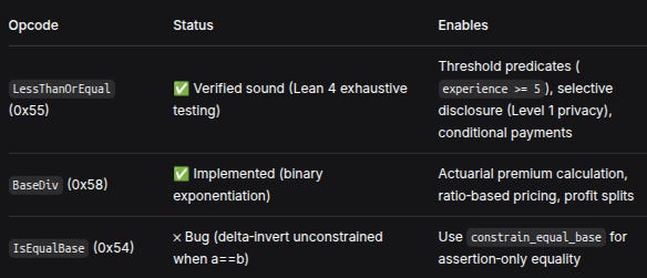 LessThanOrEqual(0x55)✅ Verified sound (Lean 4 exhaustive testing)Threshold predicates (experience >= 5), selective disclosure (Level 1 privacy), conditional paymentsBaseDiv(0x58)✅ Implemented (binary exponentiation, Fermat’s little theorem)Actuarial premium calculation, ratio‑based pricing, profit splitsIsEqualBase(0x54)❌ Bug (delta‑invert unconstrained when a == b)Useconstrain_equal_basefor assertion‑only equality