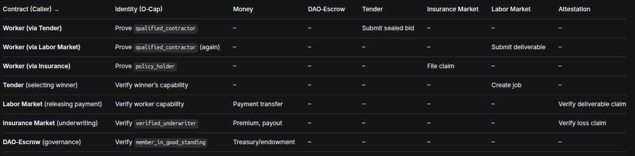 The “Composability & General Primitives” chapter includes a cross‑contract composability matrix that maps which contracts call which, and which O‑Cap capabilities are verified. For the mutual pipeline – the worker’s journey from credential to wage – the relevant subset is as follows: