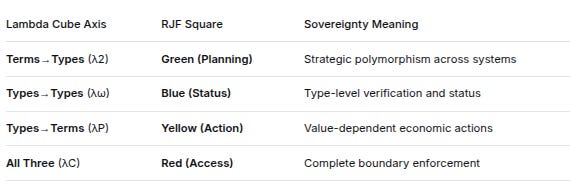Lambda Cube AxisRJF SquareSovereignty MeaningTerms→Types (λ2)Green (Planning)Strategic polymorphism across systemsTypes→Types (λω)Blue (Status)Type-level verification and statusTypes→Terms (λP)Yellow (Action)Value-dependent economic actionsAll Three (λC)Red (Access)Complete boundary enforcement