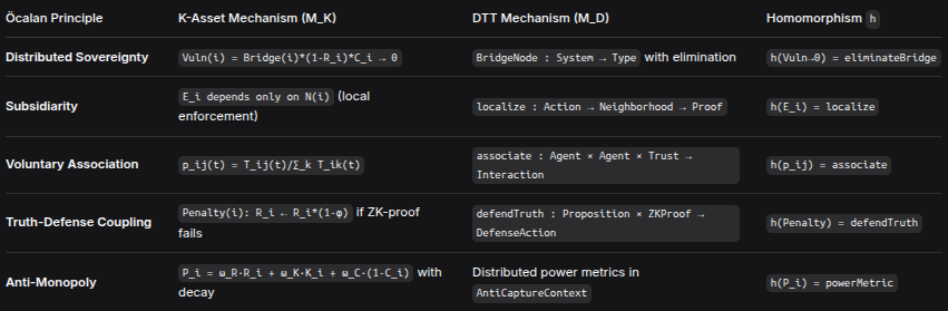 Öcalan PrincipleK-Asset Mechanism (M_K)DTT Mechanism (M_D)Homomorphism hDistributed SovereigntyVuln(i) = Bridge(i)*(1-R_i)*C_i → 0BridgeNode : System → Type with eliminationh(Vuln→0) = eliminateBridgeSubsidiarityE_i depends only on N(i) (local enforcement)localize : Action → Neighborhood → Proofh(E_i) = localizeVoluntary Associationp_ij(t) = T_ij(t)/∑_k T_ik(t)associate : Agent × Agent × Trust → Interactionh(p_ij) = associateTruth-Defense CouplingPenalty(i): R_i ← R_i*(1-φ) if ZK-proof failsdefendTruth : Proposition × ZKProof → DefenseActionh(Penalty) = defendTruthAnti-MonopolyP_i = ω_R·R_i + ω_K·K_i + ω_C·(1-C_i) with decayDistributed power metrics in AntiCaptureContexth(P_i) = powerMetric4.2 State Space Homomorphism