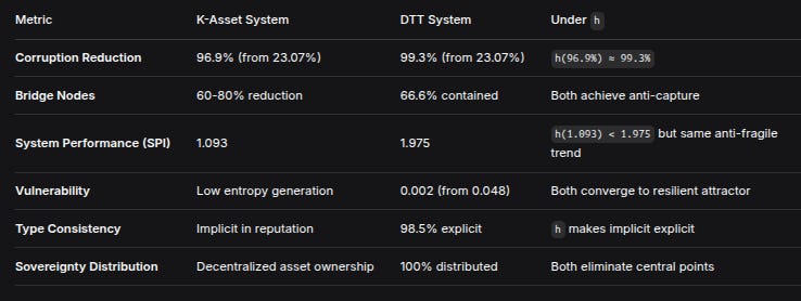 MetricK-Asset SystemDTT SystemUnder hCorruption Reduction96.9% (from 23.07%)99.3% (from 23.07%)h(96.9%) ≈ 99.3%Bridge Nodes60-80% reduction66.6% containedBoth achieve anti-captureSystem Performance (SPI)1.0931.975h(1.093) < 1.975 but same anti-fragile trendVulnerabilityLow entropy generation0.002 (from 0.048)Both converge to resilient attractorType ConsistencyImplicit in reputation98.5% explicith makes implicit explicitSovereignty DistributionDecentralized asset ownership100% distributedBoth eliminate central points8. Practical Interpretation