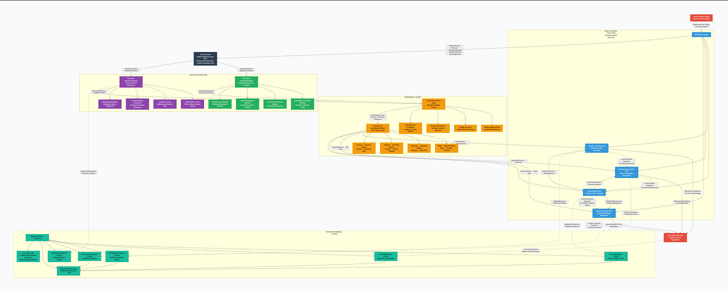 At the apex sits the Control Centroid—a capital-intelligence fusion node characterized by extreme privacy asymmetry (0.95) and minimal funding sovereignty (0.10). This mathematical representation reveals the system’s core contradiction: near-total opacity of control mechanisms combined with almost complete dependency on external funding. This centroid doesn’t directly manage operations but establishes the strategic framework through two parallel factional structures, creating a classic intelligence community approach of compartmentalization and plausible deniability.