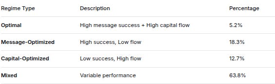 Regime TypeDescriptionPercentageOptimalHigh message success + High capital flow5.2%Message-OptimizedHigh success, Low flow18.3%Capital-OptimizedLow success, High flow12.7%MixedVariable performance63.8%