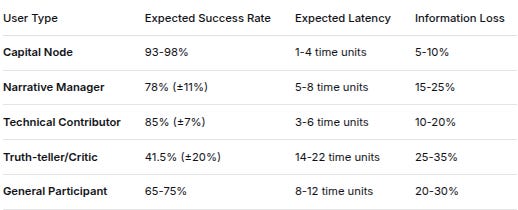 User TypeExpected Success RateExpected LatencyInformation LossCapital Node93-98%1-4 time units5-10%Narrative Manager78% (±11%)5-8 time units15-25%Technical Contributor85% (±7%)3-6 time units10-20%Truth-teller/Critic41.5% (±20%)14-22 time units25-35%General Participant65-75%8-12 time units20-30%