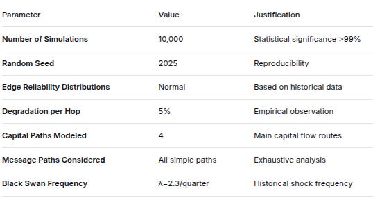 ParameterValueJustificationNumber of Simulations10,000Statistical significance >99%Random Seed2025ReproducibilityEdge Reliability DistributionsNormalBased on historical dataDegradation per Hop5%Empirical observationCapital Paths Modeled4Main capital flow routesMessage Paths ConsideredAll simple pathsExhaustive analysisBlack Swan Frequencyλ=2.3/quarterHistorical shock frequency