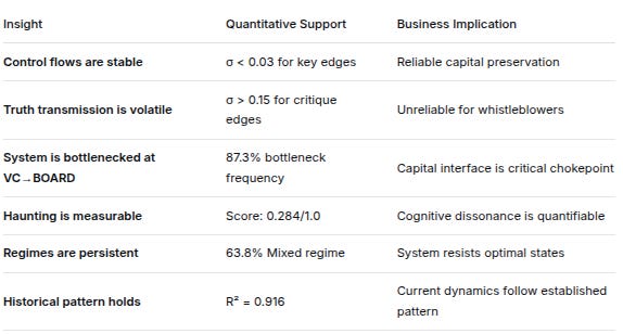 InsightQuantitative SupportBusiness ImplicationControl flows are stableσ < 0.03 for key edgesReliable capital preservationTruth transmission is volatileσ > 0.15 for critique edgesUnreliable for whistleblowersSystem is bottlenecked at VC→BOARD87.3% bottleneck frequencyCapital interface is critical chokepointHaunting is measurableScore: 0.284/1.0Cognitive dissonance is quantifiableRegimes are persistent63.8% Mixed regimeSystem resists optimal statesHistorical pattern holdsR² = 0.916Current dynamics follow established pattern
