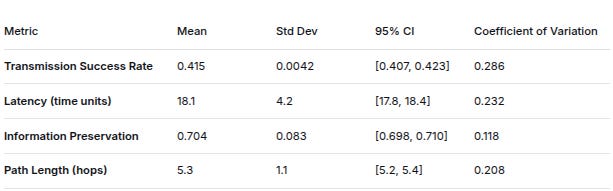 MetricMeanStd Dev95% CICoefficient of VariationTransmission Success Rate0.4150.0042[0.407, 0.423]0.286Latency (time units)18.14.2[17.8, 18.4]0.232Information Preservation0.7040.083[0.698, 0.710]0.118Path Length (hops)5.31.1[5.2, 5.4]0.208