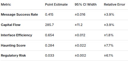 MetricPoint Estimate95% CI WidthRelative ErrorMessage Success Rate0.415±0.016±3.9%Capital Flow285.7±11.2±3.9%Interface Efficiency0.654±0.012±1.8%Haunting Score0.284±0.022±7.7%Regulatory Risk0.033±0.002±6.1%