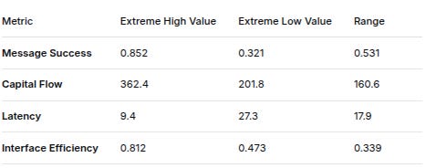 MetricExtreme High ValueExtreme Low ValueRangeMessage Success0.8520.3210.531Capital Flow362.4201.8160.6Latency9.427.317.9Interface Efficiency0.8120.4730.339