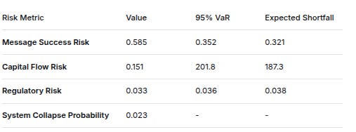 Risk MetricValue95% VaRExpected ShortfallMessage Success Risk0.5850.3520.321Capital Flow Risk0.151201.8187.3Regulatory Risk0.0330.0360.038System Collapse Probability0.023--