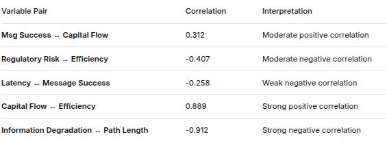 Variable PairCorrelationInterpretationMsg Success ↔ Capital Flow0.312Moderate positive correlationRegulatory Risk ↔ Efficiency-0.407Moderate negative correlationLatency ↔ Message Success-0.258Weak negative correlationCapital Flow ↔ Efficiency0.889Strong positive correlationInformation Degradation ↔ Path Length-0.912Strong negative correlation