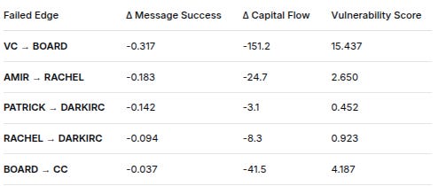 Failed EdgeΔ Message SuccessΔ Capital FlowVulnerability ScoreVC → BOARD-0.317-151.215.437AMIR → RACHEL-0.183-24.72.650PATRICK → DARKIRC-0.142-3.10.452RACHEL → DARKIRC-0.094-8.30.923BOARD → CC-0.037-41.54.187