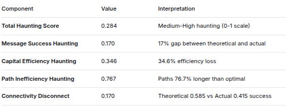 ComponentValueInterpretationTotal Haunting Score0.284Medium-High haunting (0-1 scale)Message Success Haunting0.17017% gap between theoretical and actualCapital Efficiency Haunting0.34634.6% efficiency lossPath Inefficiency Haunting0.767Paths 76.7% longer than optimalConnectivity Disconnect0.170Theoretical 0.585 vs Actual 0.415 success