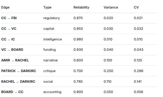 EdgeTypeReliabilityVarianceCVCC → FBIregulatory0.9700.0200.021CC → VCcapital0.9500.0300.032CC → ICintelligence0.9800.0100.010VC → BOARDfunding0.9300.0400.043AMIR → RACHELnarrative0.8000.1000.125PATRICK → DARKIRCcritique0.7000.2000.286RACHEL → DARKIRCsocial0.7800.1100.141BOARD → CCaccounting0.9000.0500.056