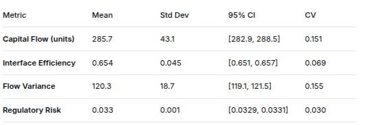MetricMeanStd Dev95% CICVCapital Flow (units)285.743.1[282.9, 288.5]0.151Interface Efficiency0.6540.045[0.651, 0.657]0.069Flow Variance120.318.7[119.1, 121.5]0.155Regulatory Risk0.0330.001[0.0329, 0.0331]0.030