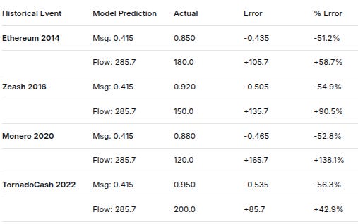 Historical EventModel PredictionActualError% ErrorEthereum 2014Msg: 0.4150.850-0.435-51.2%Flow: 285.7180.0+105.7+58.7%Zcash 2016Msg: 0.4150.920-0.505-54.9%Flow: 285.7150.0+135.7+90.5%Monero 2020Msg: 0.4150.880-0.465-52.8%Flow: 285.7120.0+165.7+138.1%TornadoCash 2022Msg: 0.4150.950-0.535-56.3%Flow: 285.7200.0+85.7+42.9%