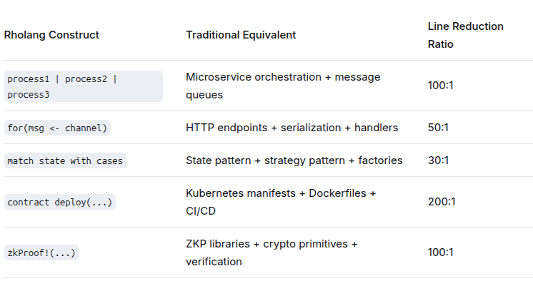 This is why Rholang can condense what would be thousands of lines of distributed systems code into dozens of lines that directly express the core concepts of sovereignty, value capture, and anti-capture defense.