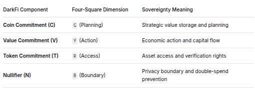 DarkFi ComponentFour-Square DimensionSovereignty MeaningCoin Commitment (C)G (Planning)Strategic value storage and planningValue Commitment (V)Y (Action)Economic action and capital flowToken Commitment (T)R (Access)Asset access and verification rightsNullifier (N)B (Boundary)Privacy boundary and double-spend prevention