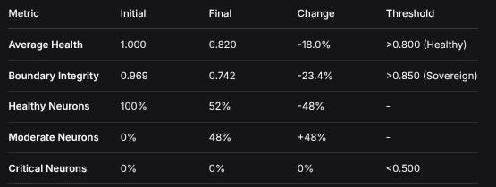 MetricInitialFinalChangeThresholdAverage Health1.0000.820-18.0%>0.800 (Healthy)Boundary Integrity0.9690.742-23.4%>0.850 (Sovereign)Healthy Neurons100%52%-48%-Moderate Neurons0%48%+48%-Critical Neurons0%0%0%<0.5002. Attack Resilience Metrics