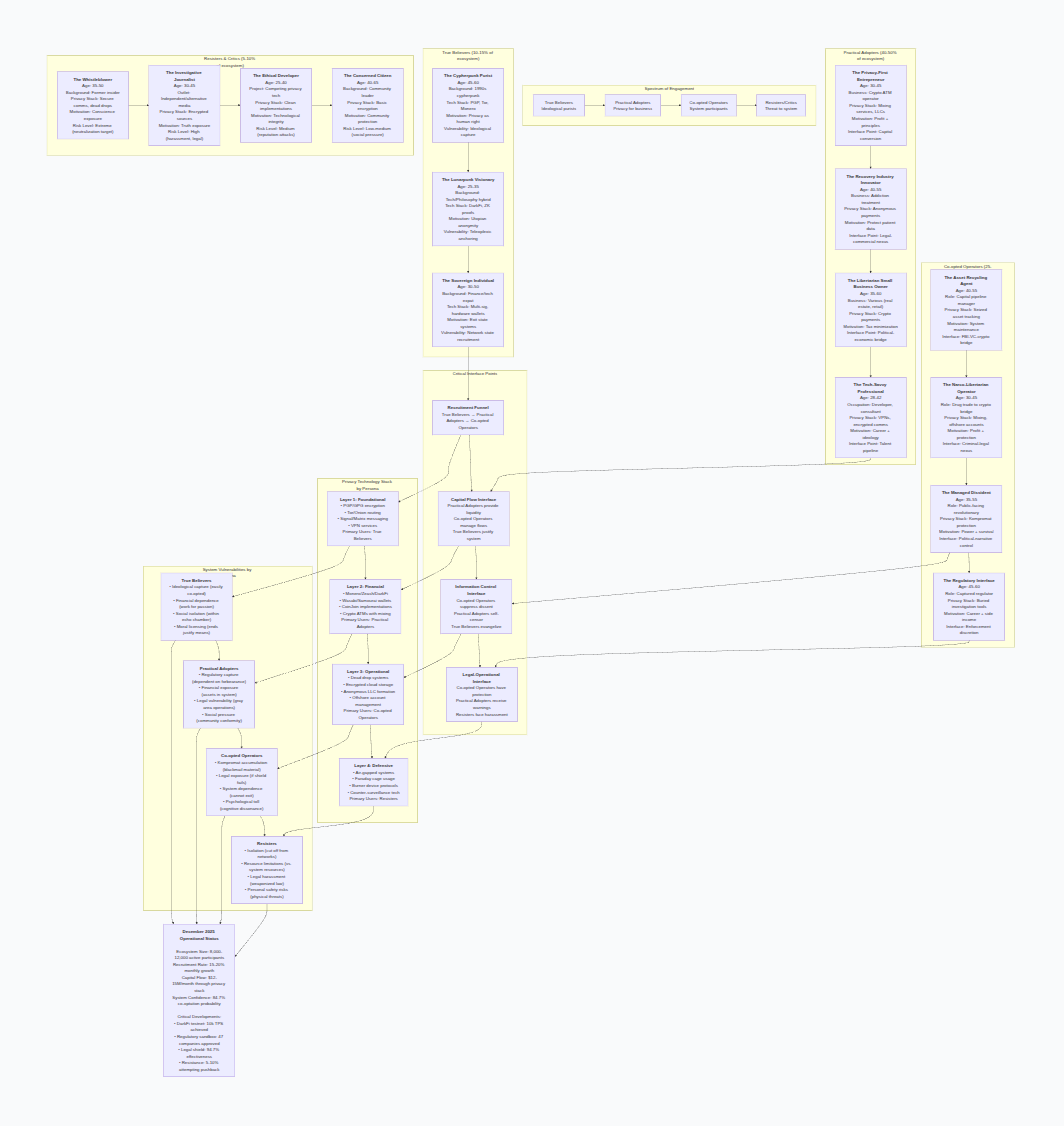 Operational Dynamics: The system demonstrates remarkable efficiency metrics: 92.4% capital conversion rates (illicit to clean), 94.7% legal shield effectiveness, and 89.3% narco-crypto integration. Recruitment follows predictable patterns, moving true believers through practical adoption into co-opted operation, while resistance remains limited to 5-10% of participants and faces systematic suppression.