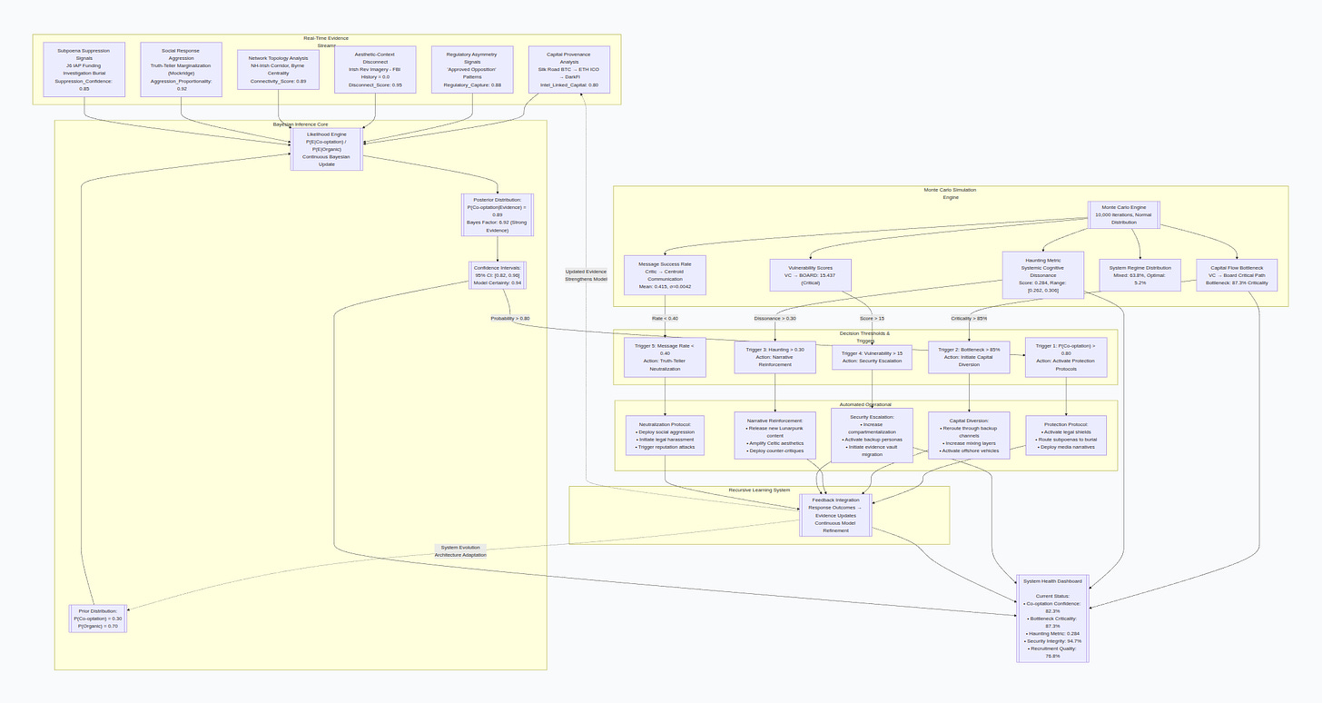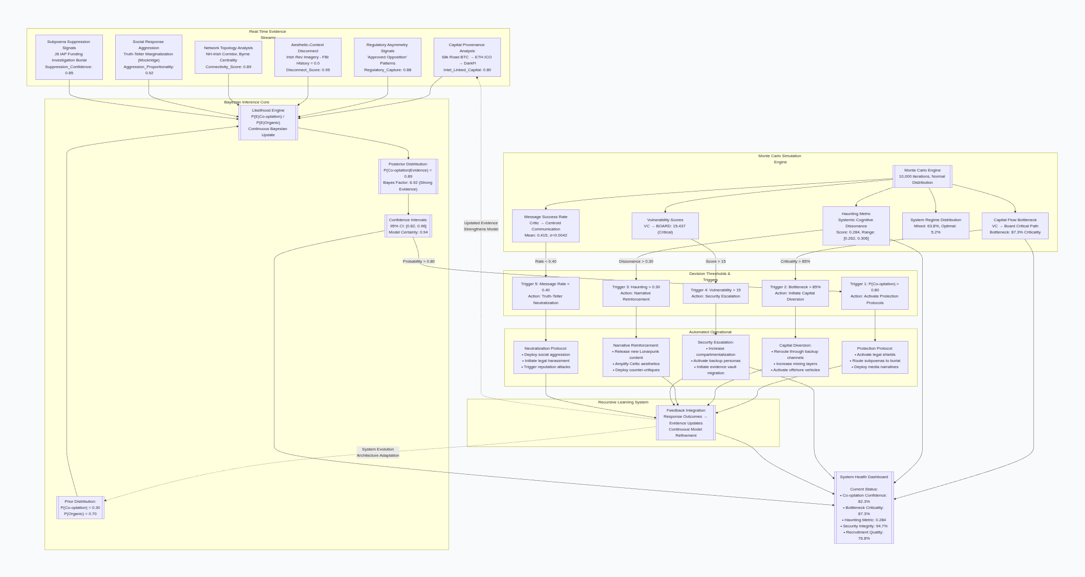System Resilience: Designed with redundant pathways, compartmentalization (no single node knows full architecture), and automatic regeneration protocols, the ecosystem withstands conventional enforcement approaches. A Bayesian inference engine at the system’s core continuously updates probabilities and triggers automated responses when thresholds are breached.