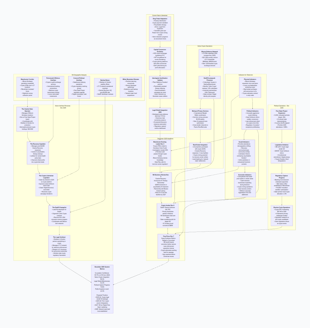 METRICS[”<b>December 2025 System Metrics</b><br/><br/>Co-optation Confidence: 84.7% (+2.4% from 2024)<br/>Narco-Crypto Integration: 89.3%<br/>Legal Shield Effectiveness: 91.2%<br/>Political Capture Progress: 76.8%<br/>Public Suspicion Level: 22.4%<br/><br/>Projected Timeline:<br/>• 2026 Q2: Crypto legal tender bill passage<br/>• 2026 Q4: First ‘crypto county’ designation<br/>• 2027: NH as ‘Digital Free State’ marketing<br/>• 2028: Network state land trust established”]