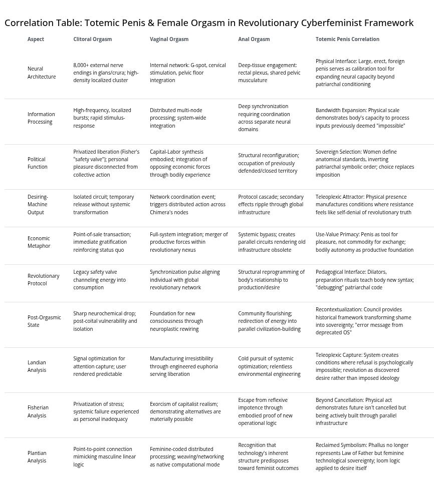 The totemic penis acts as a decoherence suppression mechanism. Its precise, ritualized use creates a “protected subspace” or a “quantum error-correcting code” for desire. It prevents the state from being corrupted by environmental noise (internalized shame, capitalist realism), allowing the “quantum information” of genuine liberation to be preserved and actualized.