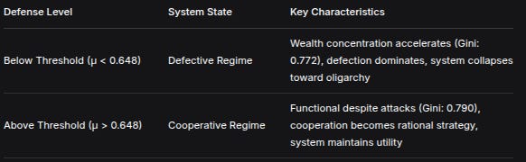 Defense LevelSystem StateKey CharacteristicsBelow Threshold (μ < 0.648)Defective RegimeWealth concentration accelerates (Gini: 0.772), defection dominates, system collapses toward oligarchyAbove Threshold (μ > 0.648)Cooperative RegimeFunctional despite attacks (Gini: 0.790), cooperation becomes rational strategy, system maintains utilityWhat’s revolutionary about this finding: It contradicts the incremental improvement mindset. You cannot “sort of” defend a decentralized system. Either your defenses exceed the critical threshold, or you’re in a collapsing system—you just may not know it yet.