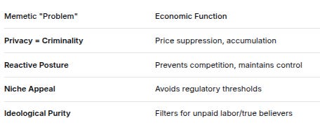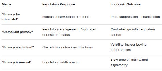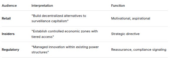 AudienceInterpretationFunctionRetail“Build decentralized alternatives to surveillance capitalism”Motivational, aspirationalInsiders“Establish controlled economic zones with tiered access”Strategic directiveRegulatory“Managed innovation within existing power structures”Reassurance, compliance signalingTHE SIGNALING EFFICIENCY