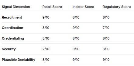 Signal DimensionRetail ScoreInsider ScoreRegulatory ScoreRecruitment9/108/106/10Coordination3/109/107/10Credentialing5/108/108/10Security2/109/108/10Plausible Deniability8/109/109/10THE GAMBETTA PARADOX