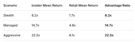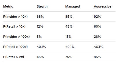 MetricStealthManagedAggressiveP(Insider > 10x)68%85%92%P(Retail > 10x)12%45%60%P(Insider > 100x)5%15%28%P(Retail > 100x)<0.1%<0.1%<0.1%P(Retail > 2x)45%75%85%Crucial Insight: Insiders have 5-7x higher probability of achieving 10x returns than retail.
