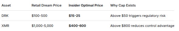 AssetRetail Dream PriceInsider Optimal PriceWhy Cap ExistsDRK$100-500$15-25Above $50 triggers regulatory riskXMR$1,000-5,000$400-600Above $800 reduces control advantageContainment Mechanisms: