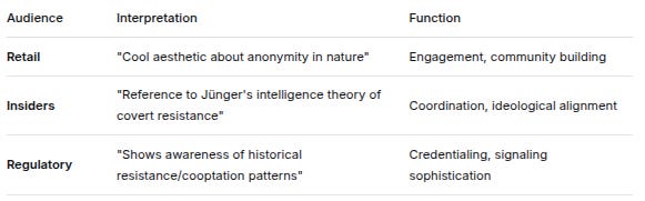 AudienceInterpretationFunctionRetail“Cool aesthetic about anonymity in nature”Engagement, community buildingInsiders“Reference to Jünger’s intelligence theory of covert resistance”Coordination, ideological alignmentRegulatory“Shows awareness of historical resistance/cooptation patterns”Credentialing, signaling sophisticationExample: “Create New Worlds” Phrase