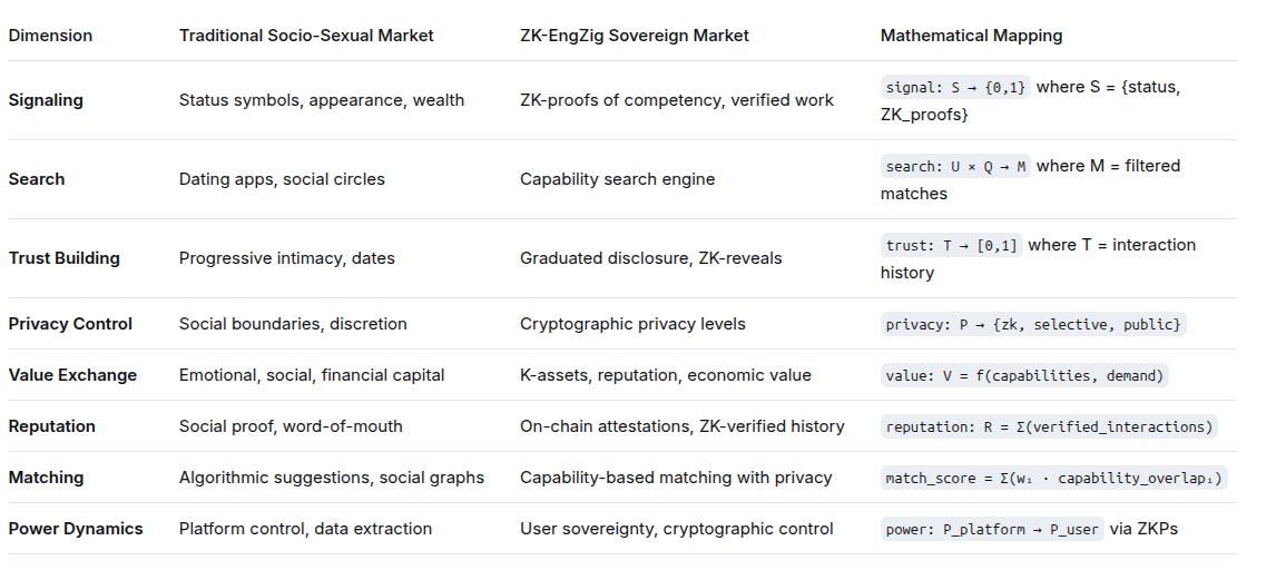 DimensionTraditional Socio-Sexual MarketZK-EngZig Sovereign MarketMathematical MappingSignalingStatus symbols, appearance, wealthZK-proofs of competency, verified worksignal: S → {0,1} where S = {status, ZK_proofs}SearchDating apps, social circlesCapability search enginesearch: U × Q → M where M = filtered matchesTrust BuildingProgressive intimacy, datesGraduated disclosure, ZK-revealstrust: T → [0,1] where T = interaction historyPrivacy ControlSocial boundaries, discretionCryptographic privacy levelsprivacy: P → {zk, selective, public}Value ExchangeEmotional, social, financial capitalK-assets, reputation, economic valuevalue: V = f(capabilities, demand)ReputationSocial proof, word-of-mouthOn-chain attestations, ZK-verified historyreputation: R = Σ(verified_interactions)MatchingAlgorithmic suggestions, social graphsCapability-based matching with privacymatch_score = Σ(wᵢ · capability_overlapᵢ)Power DynamicsPlatform control, data extractionUser sovereignty, cryptographic controlpower: P_platform → P_user via ZKPs