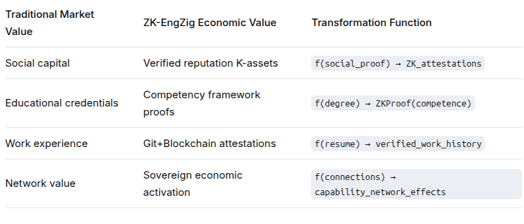 Traditional Market ValueZK-EngZig Economic ValueTransformation FunctionSocial capitalVerified reputation K-assetsf(social_proof) → ZK_attestationsEducational credentialsCompetency framework proofsf(degree) → ZKProof(competence)Work experienceGit+Blockchain attestationsf(resume) → verified_work_historyNetwork valueSovereign economic activationf(connections) → capability_network_effects