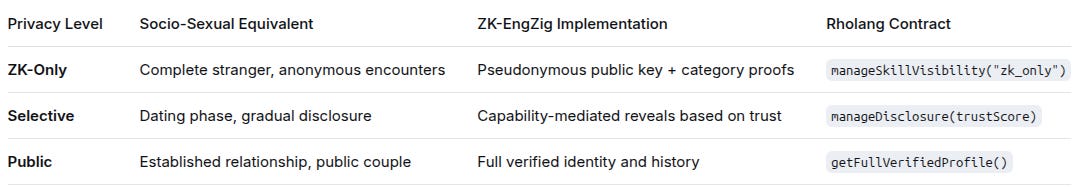 Privacy LevelSocio-Sexual EquivalentZK-EngZig ImplementationRholang ContractZK-OnlyComplete stranger, anonymous encountersPseudonymous public key + category proofsmanageSkillVisibility(”zk_only”)SelectiveDating phase, gradual disclosureCapability-mediated reveals based on trustmanageDisclosure(trustScore)PublicEstablished relationship, public coupleFull verified identity and historygetFullVerifiedProfile()