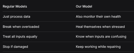 Regular ModelsOur ModelJust process dataAlso monitor their own healthBreak when overloadedHeal themselves when stressedTreat all inputs equallyKnow when inputs are confusingStop if damagedKeep working while repairingCompared to Other Self-Healing Systems: