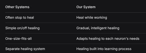 Other SystemsOur SystemOften stop to healHeal while workingSimple on/off healingGradual, intelligent healingOne-size-fits-allAdapts healing to each neuron’s needsSeparate healing systemHealing built into learning processWhat Makes It Simple (Despite Being Advanced)