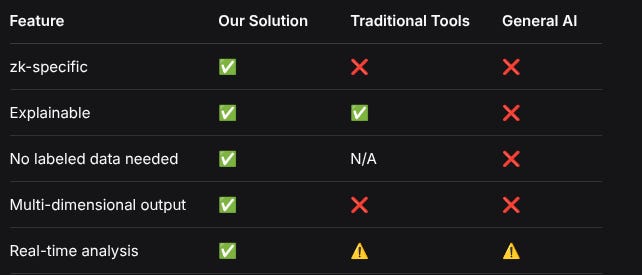 FeatureOur SolutionTraditional ToolsGeneral AIzk-specificβ